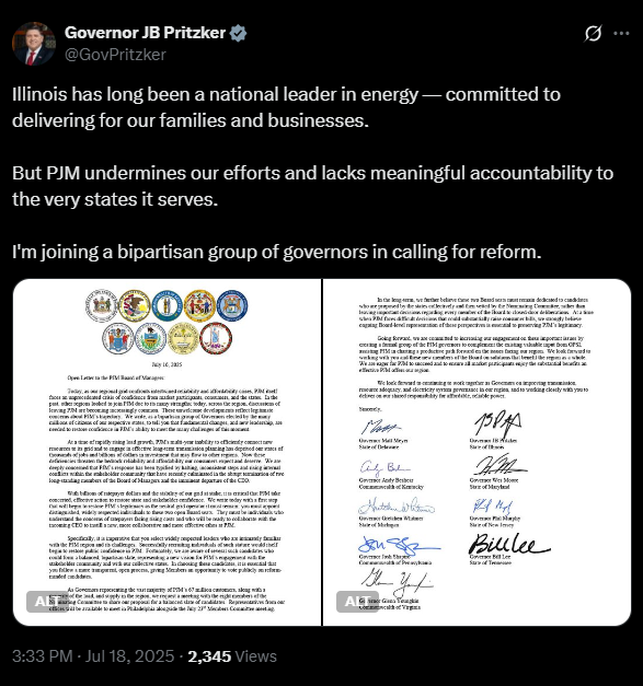 “Illinois has long been a national energy leader and is committed to delivering clean, reliable, and affordable energy to working families and businesses,” said Governor JB Pritzker. “But PJM undermines our efforts and lacks meaningful accountability to the very states it serves. I’m joining Governors from red and blue states to call for reforms that give states a real seat at the table, ensures transparency, and listens to working families and businesses. PJM must evolve and embrace reforms if it is to remain a credible partner and responsible steward for the region.”