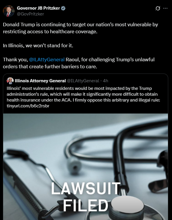 On Friday, a multistate coalition of Democratic state attorneys general, including Illinois Attorney General Kwame Raoul, sued to block changes to the Affordable Care Act (ACA) that could force nearly two million Americans off health insurance. The suit follows an effort Gov. Pritzker joined in April with other governors asking the Trump Administration to respect the ability of states to manage their state health insurance marketplaces.