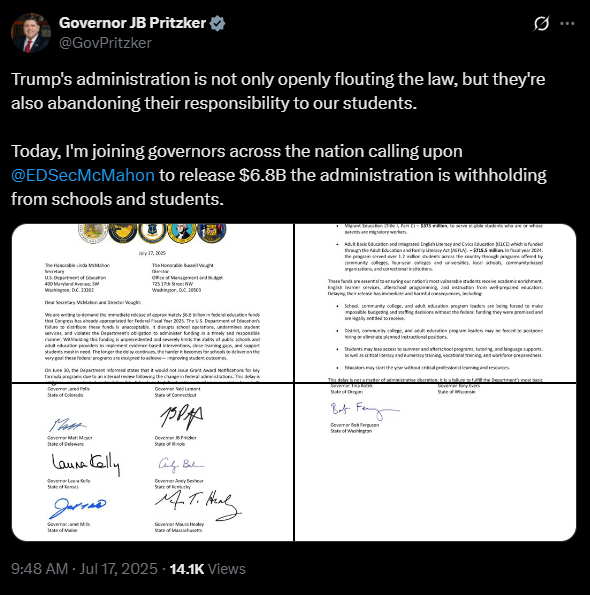 - Chalkbeat Chicago: Illinois Gov. Pritzker and 16 state leaders demand the release of $7 billion in federal funds for schools