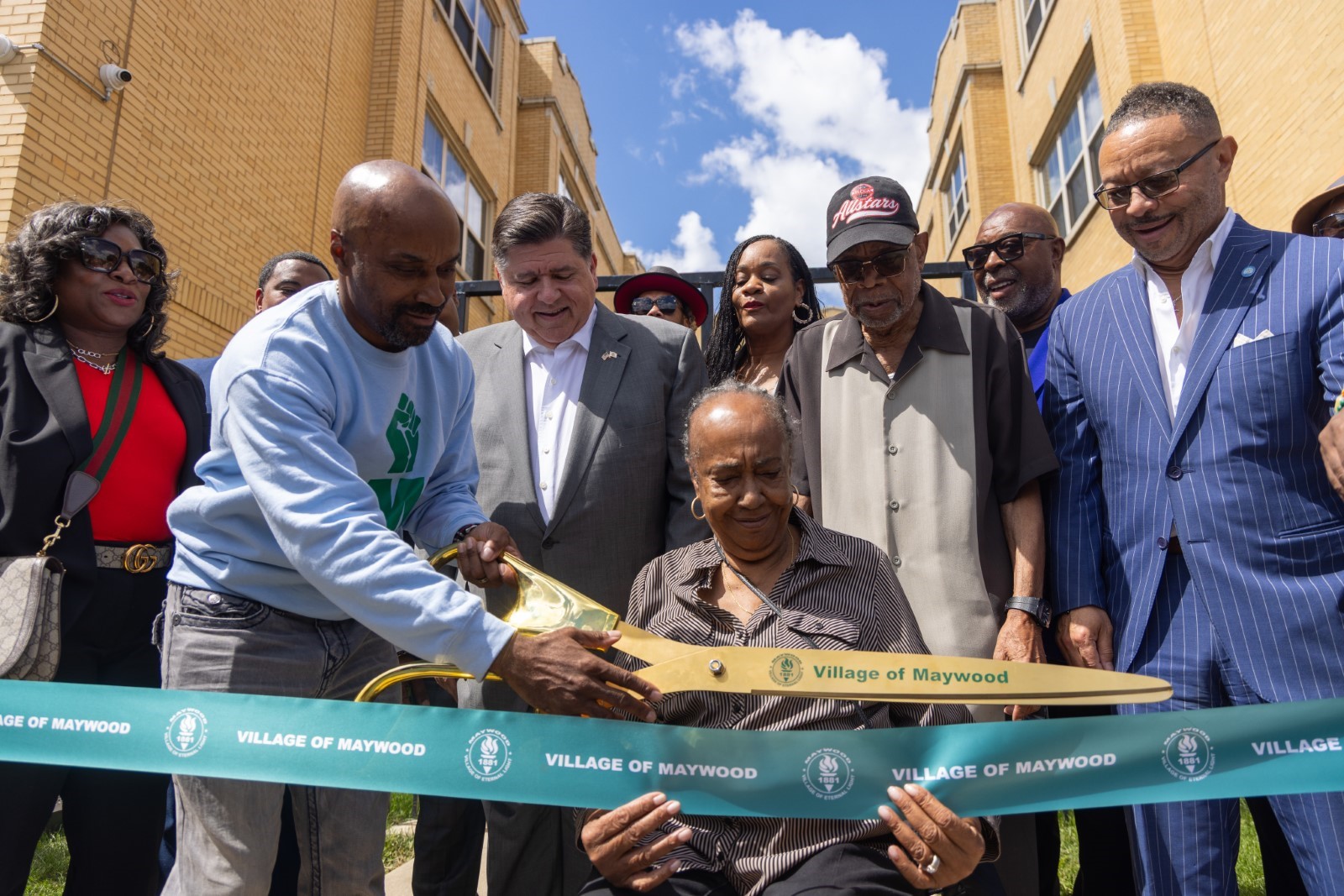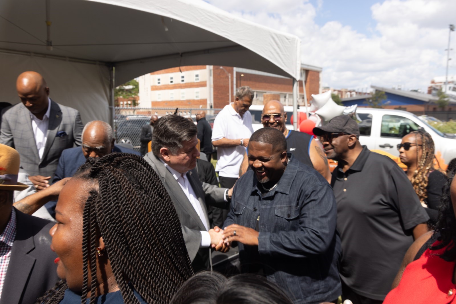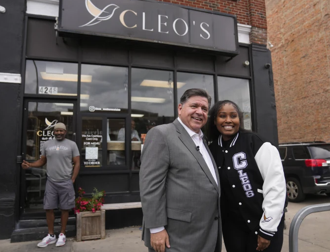 Gov. Pritzker joins Black Men United for a ribbon cutting of a new affordable housing facility in Maywood. (Office of the Governor)Gov. Pritzker meets with attendees at the Black Men United ribbon cutting for a new affordable housing facility in Maywood. (Office of the Governor)Gov. Pritzker speaks with a Chicago police officer in the Bronzeville neighborhood of Chicago. (Erin Hooley/AP)Gov. Pritzker stands with Kristen “Chef Krissy” Ashley Harper, owner and chef of Cleo’s in the Bronzeville neighborhood of Chicago. (Erin Hooley/AP)