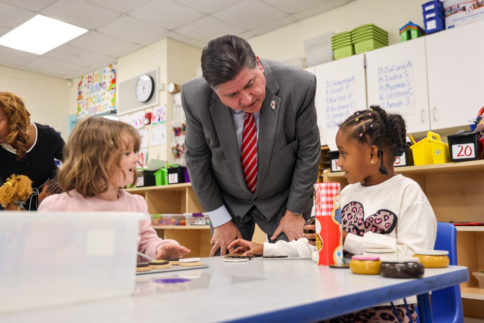 Gov. Pritzker greets students as they enter their classroom at Wagoner Elementary School in Community Consolidated Schools District (CCSD) 168 in Sauk Village to celebrate the start of the school year. (Office of the Governor)Gov. Pritzker visits with students at Wagoner Elementary School in Community Consolidated Schools District (CCSD) 168 in Sauk Village.(Office of the Governor) Gov. Pritzker meets with patrons of Los Candiles in Little Village. (Office of the Governor)Gov. Pritzker talks with residents of the Little Village neighborhood. (Office of the Governor)